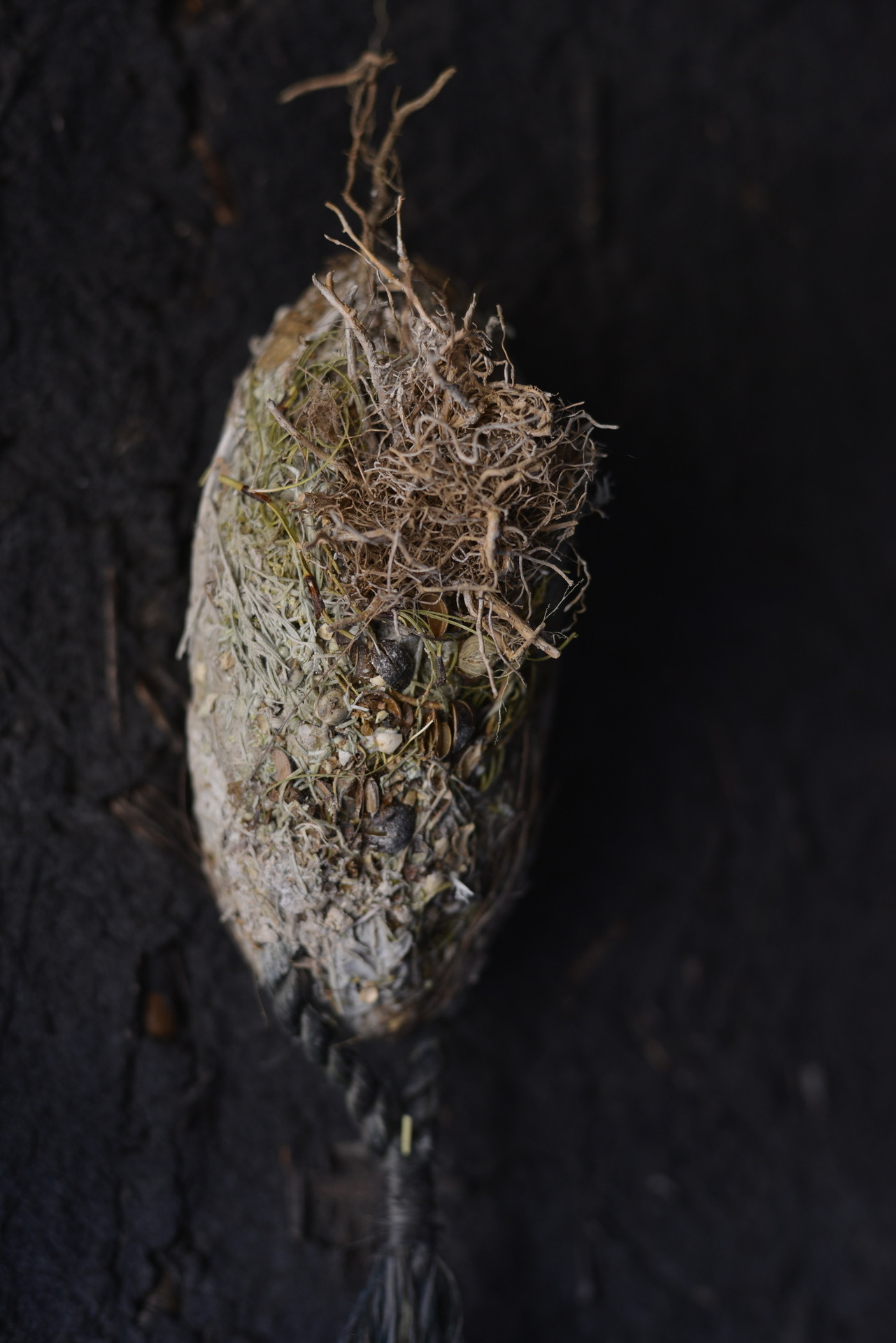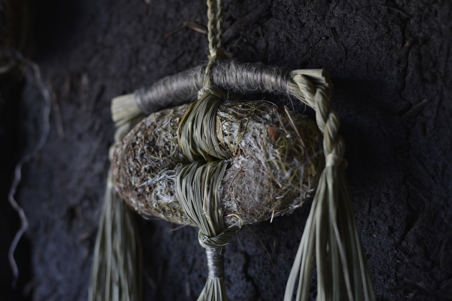 その命の循環をテーマとし、もみ殻や根などを土に練り込み、稲穂や麻や実などで形を作っています。