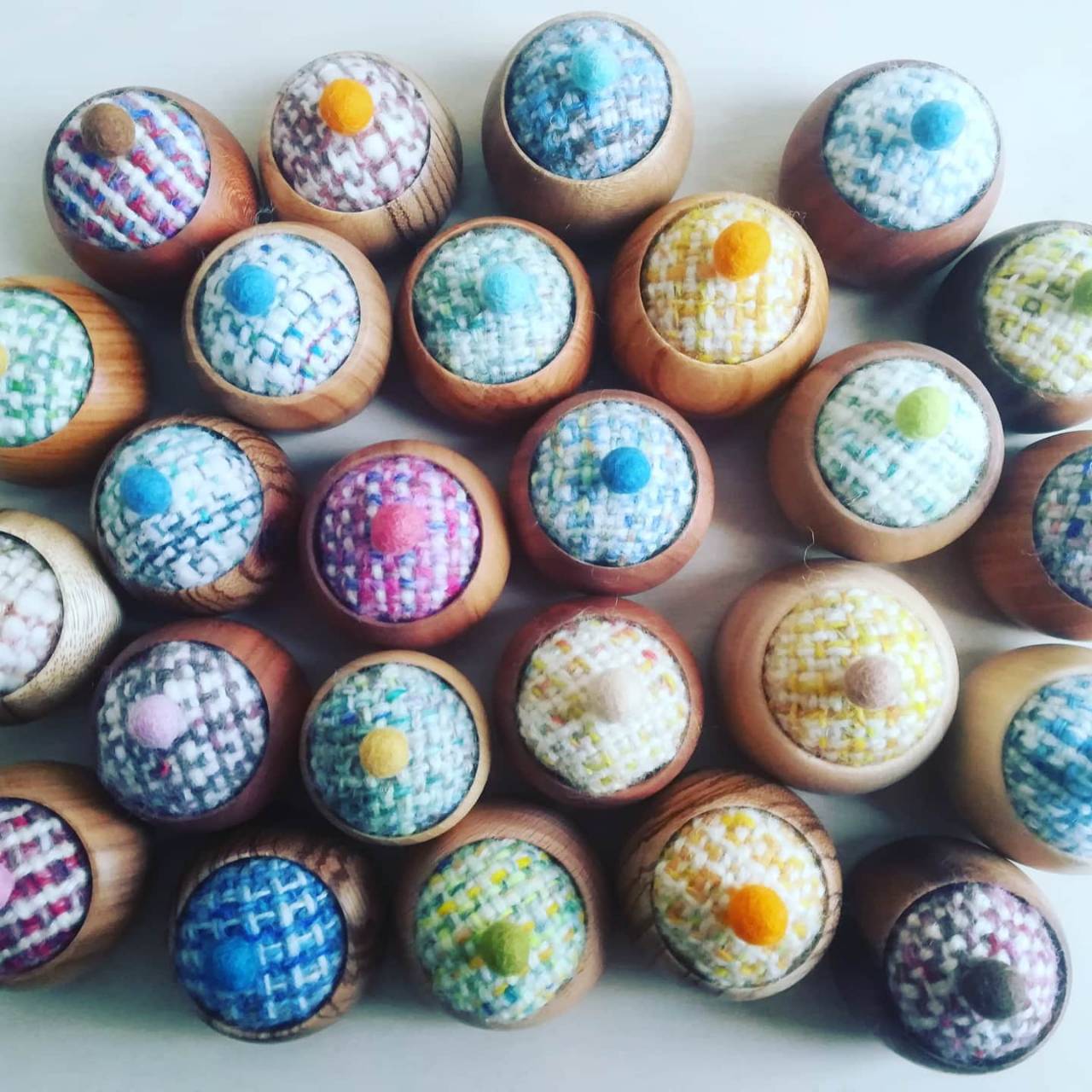 黄色、ピンク、紫色他の鮮やかな色や杢目の木を使って製作しています。