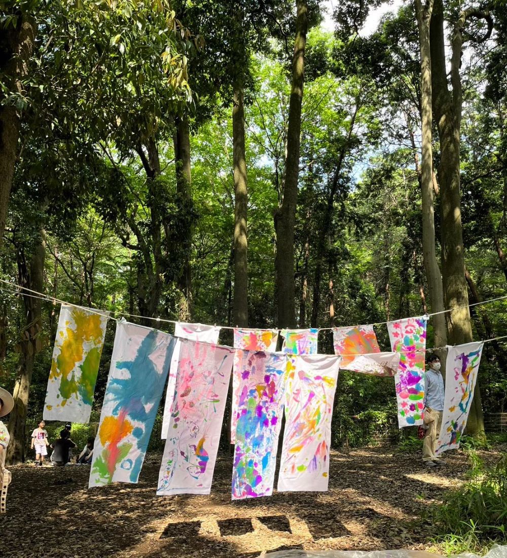 コドモもオトナも長い白い布に えのぐをのせて、木々の中に吊るして鑑賞しよう。お持ち帰り後は手ぬぐいとして使用できます。