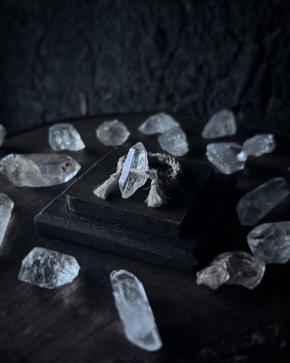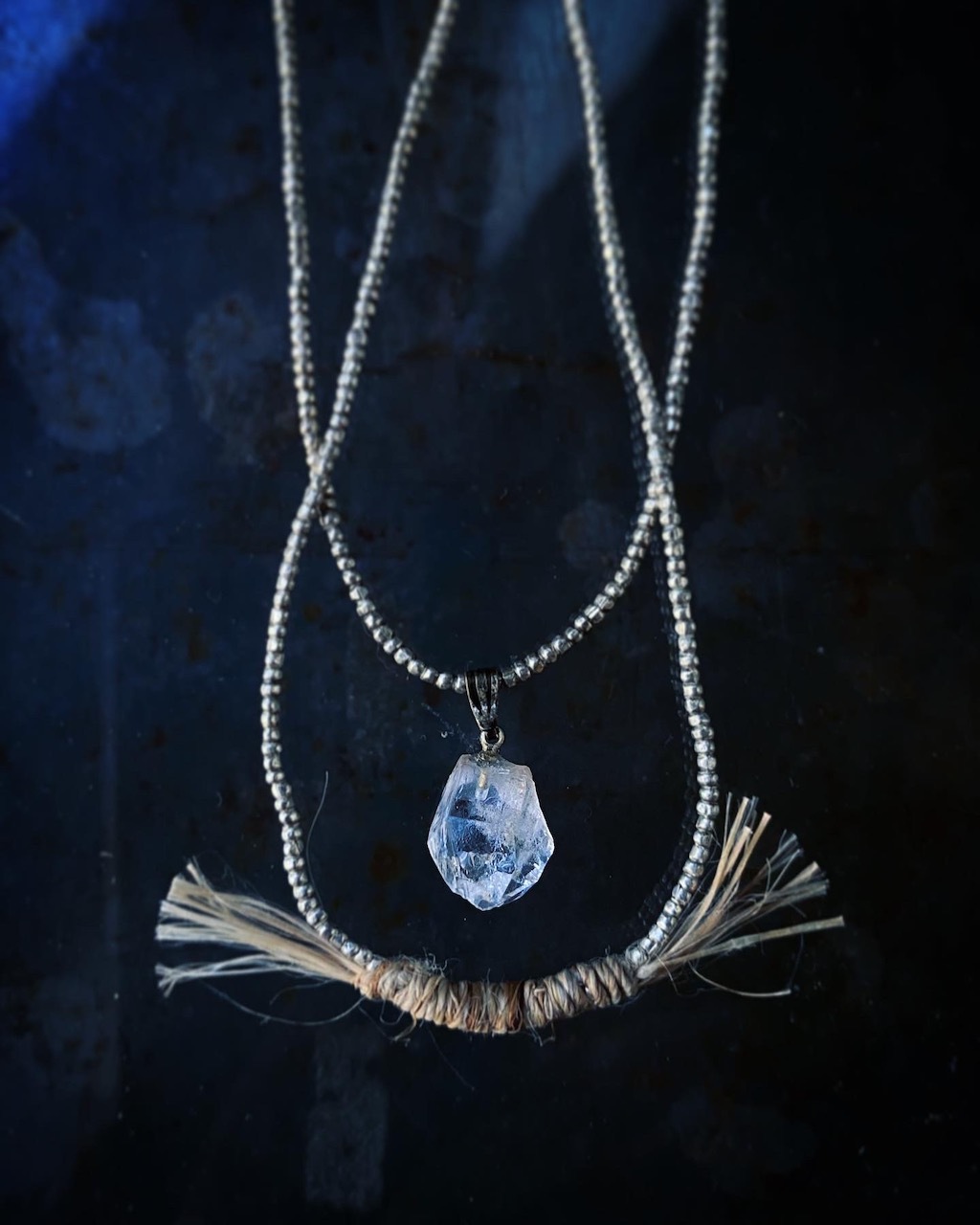 夫婦で日本の山々に分け入り自然を壊す事なく水晶などの鉱石を採集。カットを一切せずに自然の生み出した有りのままの形を生かし、己を着飾るアクセサリーではなく、古代のなんでもない民が拾い上げた美しい石を家族や愛おしいひとのためにこしらえたお護りのような装身具や生活具へと昇華させる。